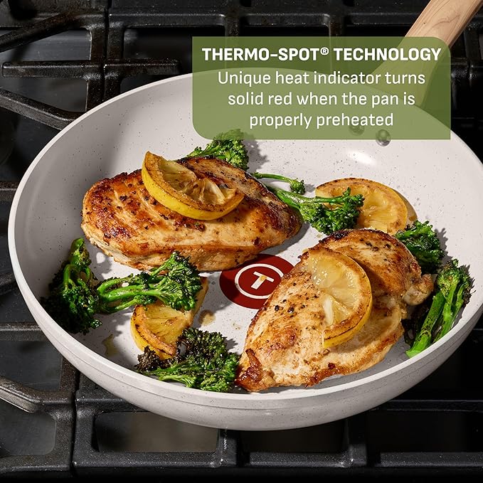 - Thermo-Spot Technology: Our unique heat indicator turns solid red to show when the pans are perfectly pre-heated. This cookware also features an even heat base that prevents hot spots for optimal cooking results