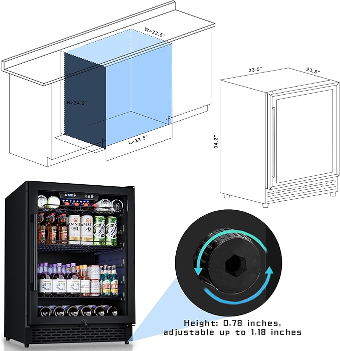 - GENEROUS STORAGE SPACE:With compact dimensions of 23.46"W x 23.46"D x 34.251"H, this beverage refrigerator offers versatile storage for a range of containers, including wine, champagne bottles, and standard cans