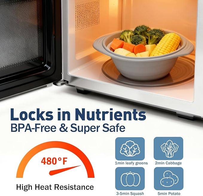- 【Premium Food-Grade Silicone — Safe Up to 480°F】Made from BPA-free, heat-resistant silicone, this silicone microwave steamer delivers safe and even heating without melting or warping. It's heat-resistant (-40°F to 446°F), odorless, and incredibly durable. A cleaner, safer to plastic steamers or bulky glass.