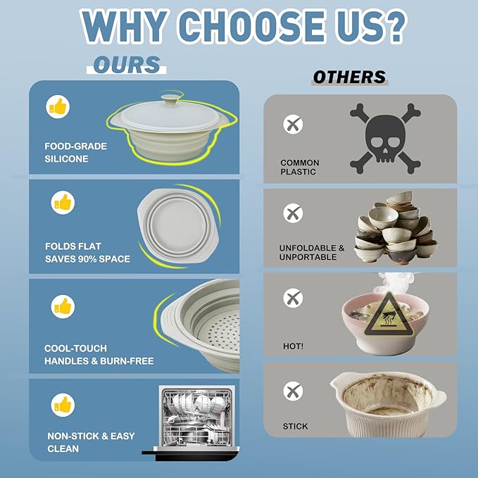 - 【Easy to Clean — Dishwasher Safe & Odor Resistant】Engineered for convenience, this silicone microwave steamer rinses clean in seconds and is fully dishwasher safe. Silicone resists stains, odors, and sticking—much easier to maintain than stainless steel or plastic microwave vegetable steamers.