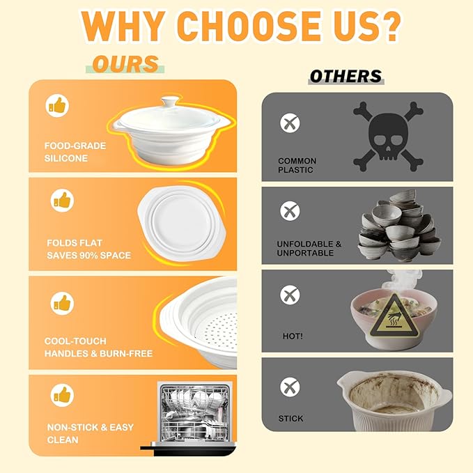 - 【Easy to Clean — Dishwasher Safe & Odor Resistant】Engineered for convenience, this silicone microwave steamer rinses clean in seconds and is fully dishwasher safe. Silicone resists stains, odors, and sticking—much easier to maintain than stainless steel or plastic microwave vegetable steamers.