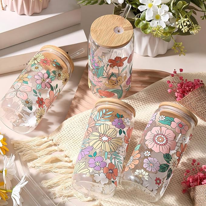- Bohemian Flower Glass Tumbler Set: the package contains 4 pieces of 16 oz glass cups, printed with 4 different bohemian flower patterns, 4 matching natural bamboo lids, 4 reusable elbow glass straws and 4 straw brushes; It can be applied repeatedly and given as a gift, and it is a very practical combination set; Please do not clean the cup with sharp objects to avoid scratching the design