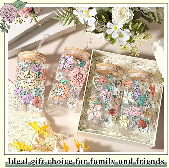 Mumufy 4 Pcs Gift for Women Bohemian Flower Cute Glass Cup Tumbler Boho Floral Iced Coffee Mugs 16 oz Glass with Bamboo Lid & Straw, Mothers Day Birthday Gift for Mom Sister Bridesmaid Baby Shower