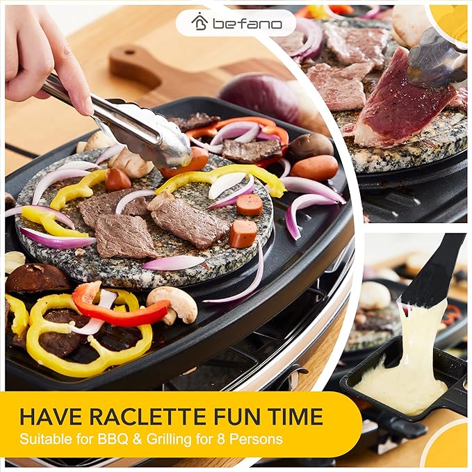 - 3-in-1 Multifunction Machine: Cook chocolate, cheese, broth, or oil in the fondue pot. Grill meat, seafood, and vegetables on the grill plate. Raclette cheese, desserts, and more food on the raclette pans at the same time