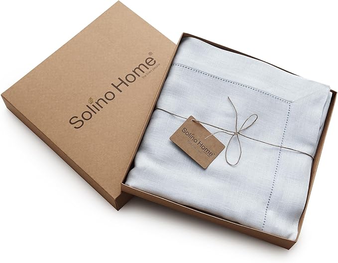Solino Home Light Blue Linen Tablecloth 60 x 144 Inch - 100% Pure Linen Hemstitch Table Cloth for Rectangle Tables - Classic Hemstitch, Machine Washable Tablecloth for New Year