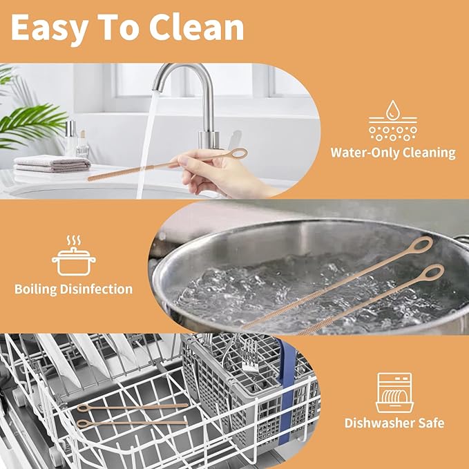 - Easy to Clean and Store: Our straw brushes is wrapped in silicone so you can wash it in the dishwasher or rinse it with water, due to the hydrophobic nature of silicone, it can be gently tumbled dry to keep it clean and hygienic, and there is a hanging hole on the end so you can hang it to dry as well.