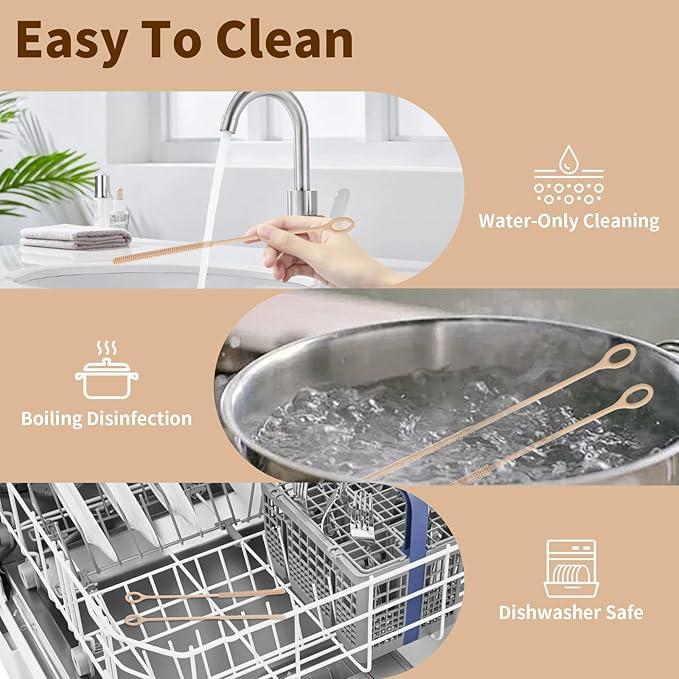 - Easy to Clean and Store: Our straw brushes is wrapped in silicone so you can wash it in the dishwasher or rinse it with water, due to the hydrophobic nature of silicone, it can be gently tumbled dry to keep it clean and hygienic, and there is a hanging hole on the end so you can hang it to dry as well.