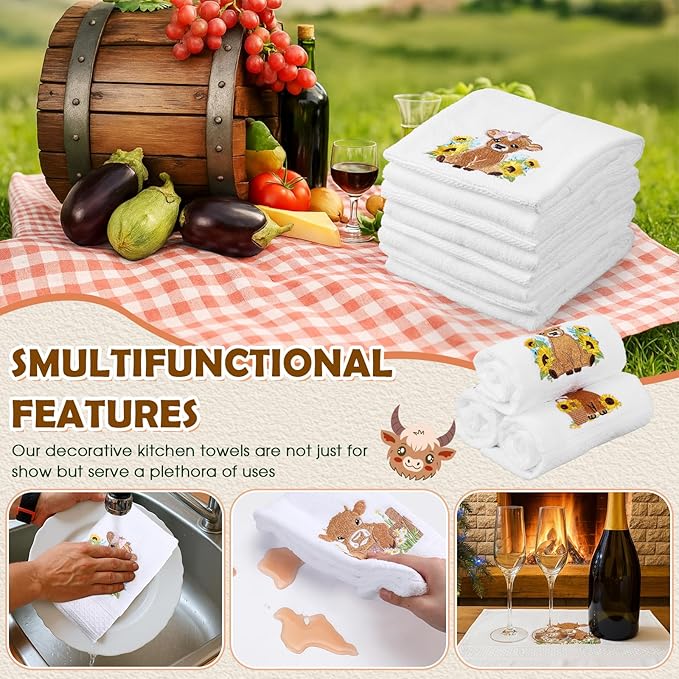 - Embroidered Highland Cow with Sunflower Design: each cute embroidered kitchen towel features an adorable embroidered Highland cow with sunflowers and rustic details; These farmhouse kitchen towels bring warmth and charm to your home decor, making them ideal for cow lovers and country-themed bathrooms or kitchens