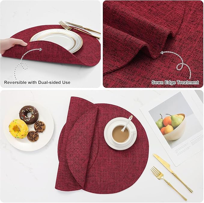 homing 15 Inch Round Cloth Placemats Set of 4, Cotton Linen Blend Washable Table Mats, Farmhouse Dining Place Mats for Indoors & Outdoors, Easy to Clean, Red