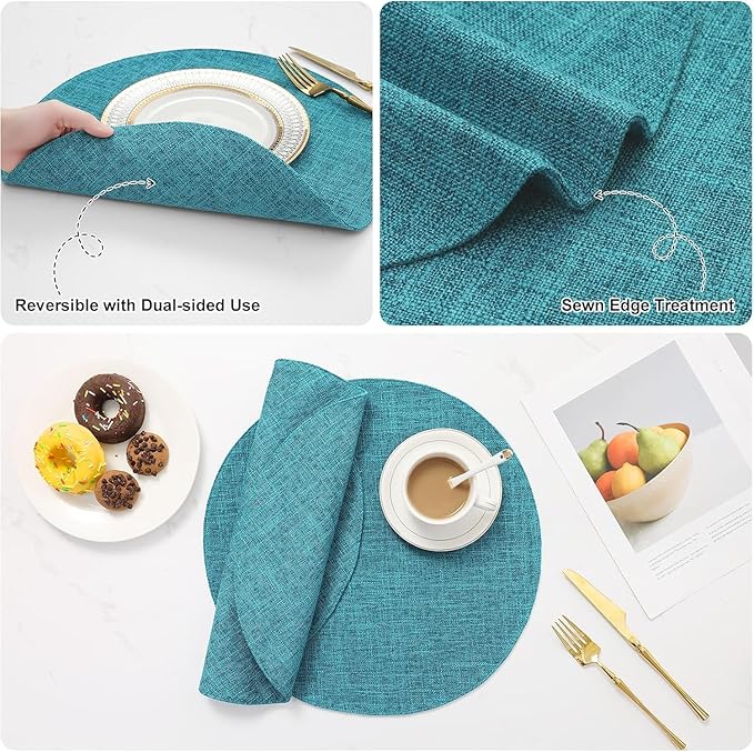 homing 15 Inch Round Cloth Placemats Set of 4, Cotton Linen Blend Washable Table Mats, Farmhouse Dining Place Mats for Indoors & Outdoors, Easy to Clean, Teal