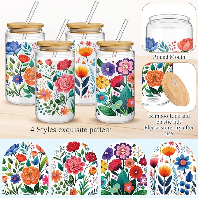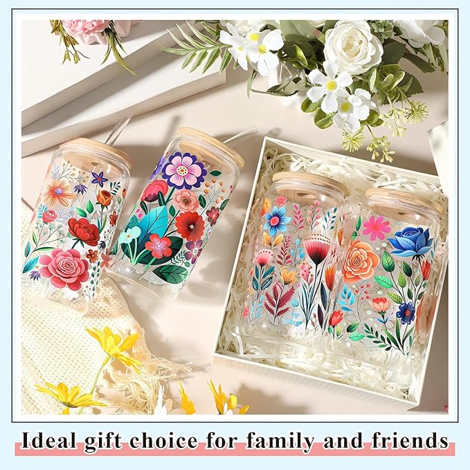 - Abstract Flower Glass Tumbler Set: the package contains 4 pieces of 16 oz glass cups, printed with 4 different abstract flower patterns, 4 matching bamboo lids, 4 reusable elbow glass straws and 4 straw brushes; It can be applied repeatedly and given as a gift, and it is a very practical combination set; Please do not clean the cup with sharp objects to avoid scratching the design