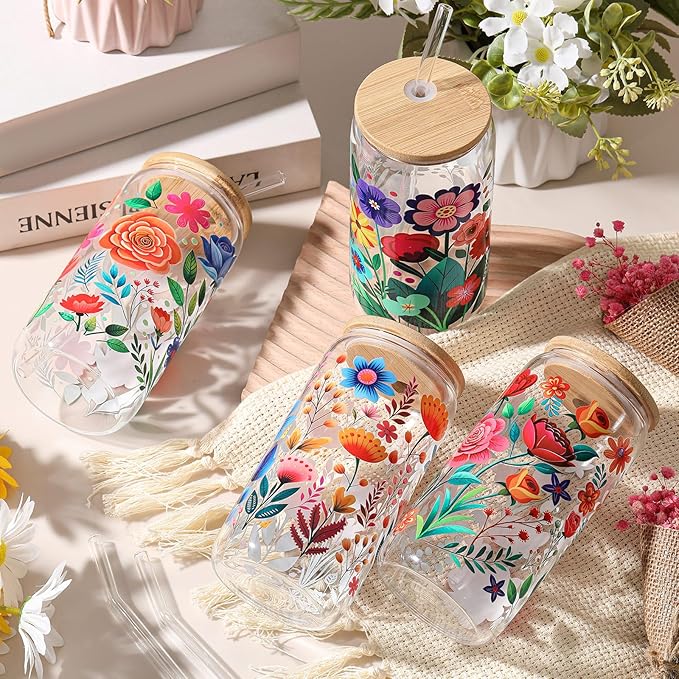 Mumufy Gift for Women Cute Glass Cup Tumbler Flower Iced Coffee Mugs 16 oz Glass with Bamboo Lid & Straw, Mothers Day Birthday Gift for Mom Sister Bridesmaid Baby Shower(4 Pack,Abstract Flower)