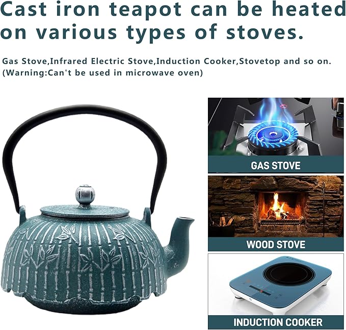 - 【WONDERFUL DESIGN】Cast iron teapot is with bamboo leaf pattern on the surface. It is the necessary decoration to any kitchen.It is a masterful collection for tea lovers. Cast iron teapot could break down the element of Fe2+, which is beneficial to your body. Cast iron teapot also has long heat preservation. So the water after boiled by our cast iron teapot can be more sweeter and softer, which is suitable for all kinds of tea making or other drinks making.