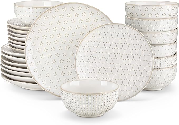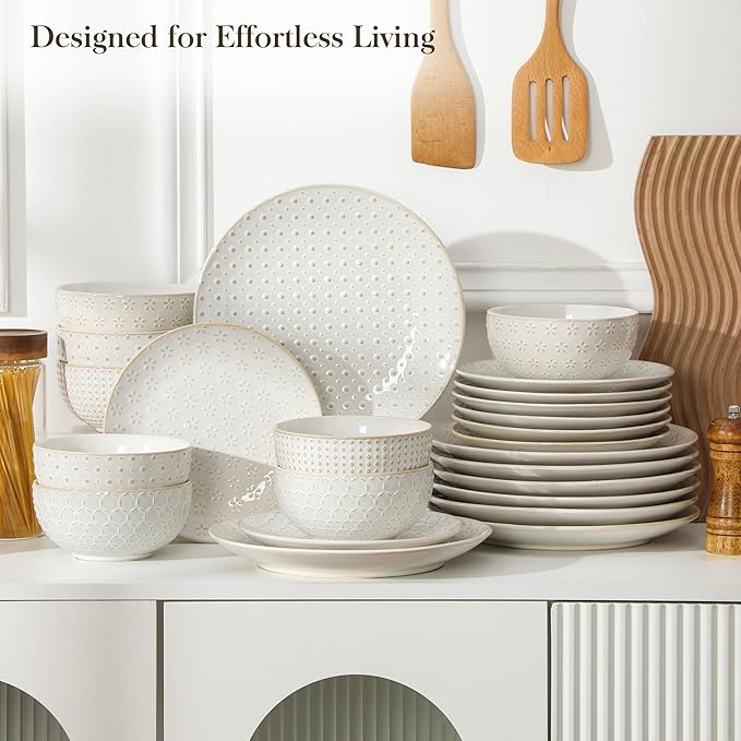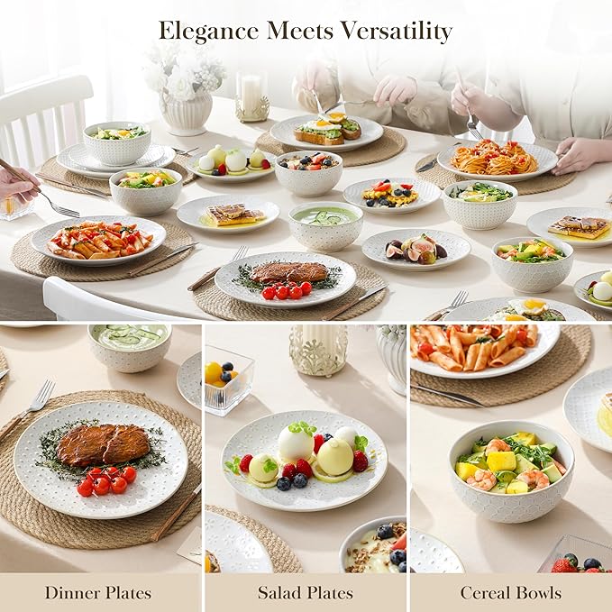 - 【Versatile for Any Cuisine & Décor | Timeless Design】With its classic shapes and subtle embossed design, this set boasts a timeless style. It pairs perfectly with everything from hearty homemade meals to elegant plated dinners. Its versatile aesthetic complements various home décors like modern, Scandinavian, or rustic styles, making it a beautiful and practical dinnerware collection for all occasions.