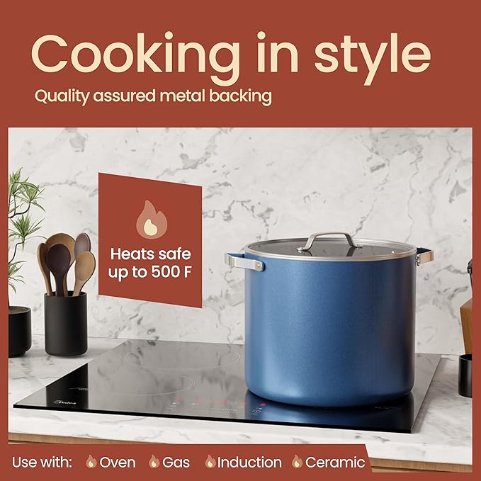 - NON-TOXIC BY DESIGN - Made with a ceramic coating inside and out, this stock pot with lid is free from PTFE, PFAS, BPA, and other harmful chemicals. It’s FDA and CA65-compliant, ensuring a safe, non-allergenic cooking experience for the whole family.