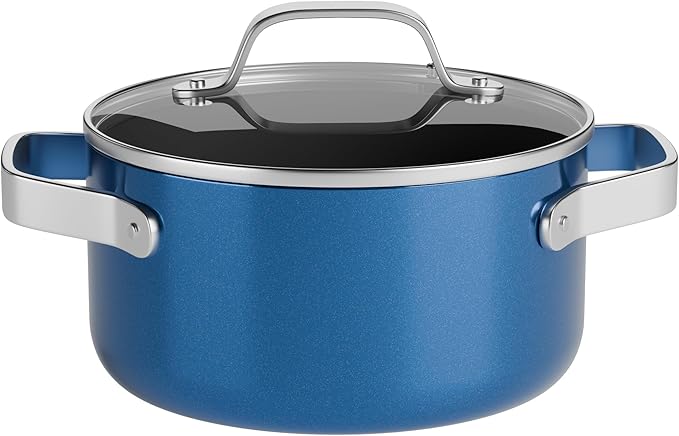 Bakken 3 Quart Ceramic Coated Stock Pot with Lid, Easy to Clean Nonstick Pot, Tempered Glass Lid, Riveted Stainless Steel Handles, Oven Safe Up To 500°F, PTFE & PFAS Free, All Stove Compatible, Blue