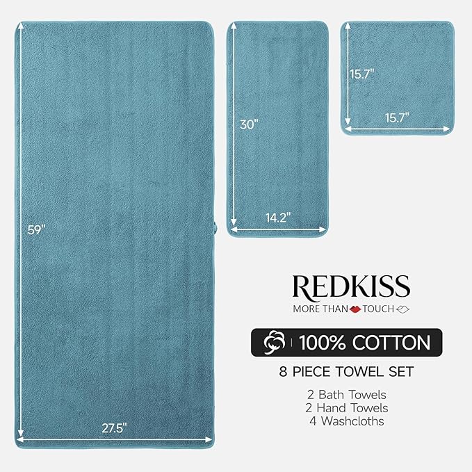 REDKISS 6-Piece Bath Towel Set, Ultra-Plush & Highly Absorbent 100% Cotton Towels for Bathroom, Blue Set Includes 2 Bath Towels, 2 Hand Towels, 2 Washcloths