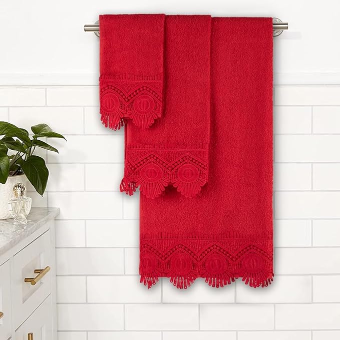3 Piece Laced Bath Towels Set for Bathroom, Bath, Hand & Wash Cloths, Decorative Stylish Plush Cotton Washcloths - Showering, Face & Body Washing, Airbnb Essentials & Host Accessories, Red