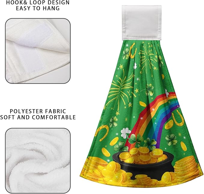 - Hanging Design: Our lucky rainbow shamrock hand towels with a magic sticker hook ,the towel can be hung on any place that needs to be washed or wiped, and the magic sticker is strong and hard to drop