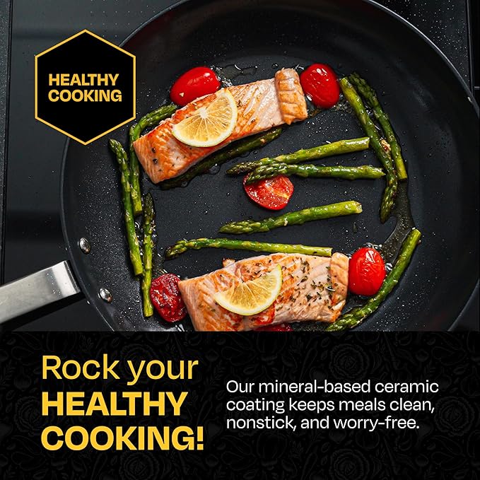 - NO STICK, NO STRESS: Food slides right off with our ceramic nonstick frying pans. No more stuck on messes or excess oil. This nonstick surface delivers epic food release with less oil or butter. Flavor should stick with you, not your pan.