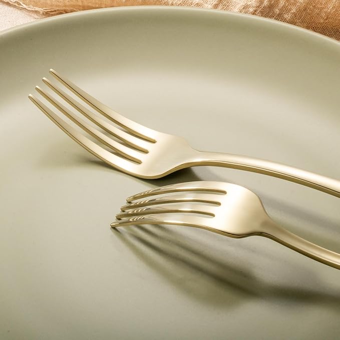 - INCLUDES: Champagne Gold Mirror 45-piece flatware set with service for 8. Set includes 8 each: dinner knife, dinner fork, salad fork, dinner spoon and teaspoon. Plus 1 each:serving tablespoon, pierced tablespoon, cold meat fork, butter knife, and sugar spoon