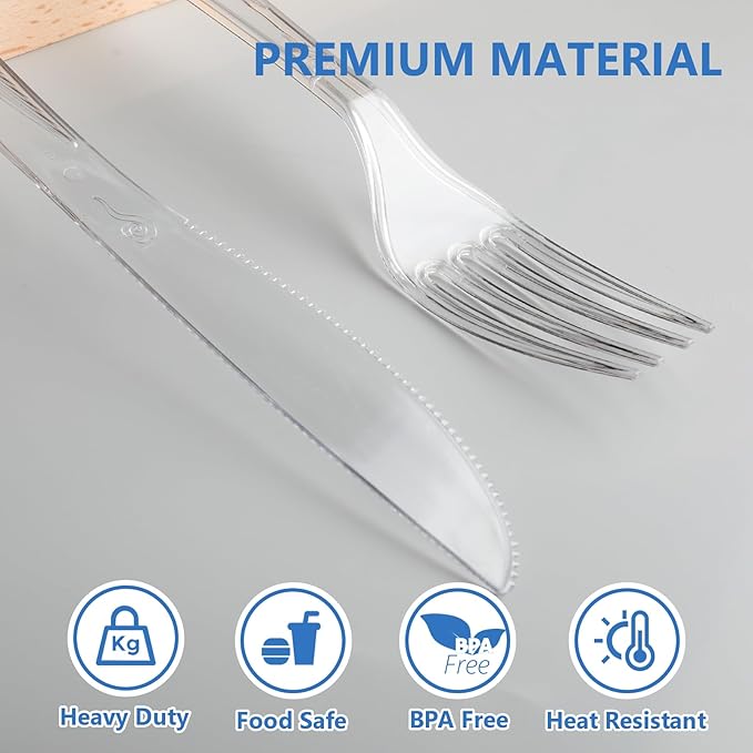 - 【Classic Match 】This disposable silverware transparent can be easily match any types of decor, and gives a good display. The crystal clear look makes it clean and sleek with no feeling of cheap plastic.