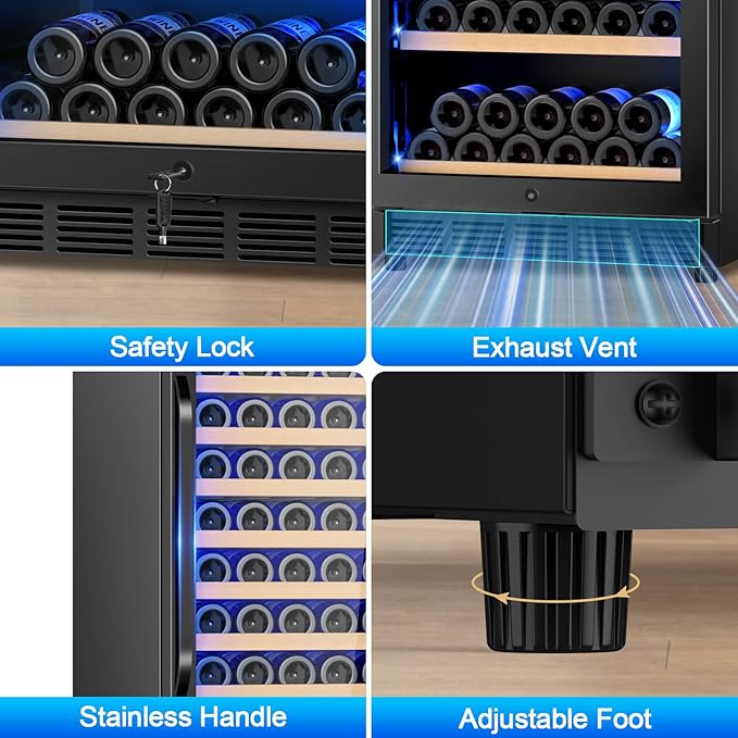 - Smart Touch Control & Ambiance Lighting - Control your wine environment with a single touch. The intuitive digital touch panel allows for precise temperature adjustments and lighting control. The elegant gentle blue LED interior light showcases your collection beautifully, creating a sophisticated ambiance for your home bar or dining area without generating heat.