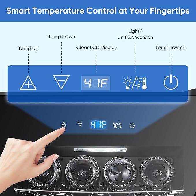 - USER-FRIENDLY DIGITAL TEMPERATURE CONTROL - Designed with an intuitive digital control panel and LCD, this wine fridge allows precise temperature adjustments without opening the door. The clear display shows the current temperature setting, helping reduce temperature fluctuations and maintain a stable internal environment